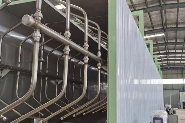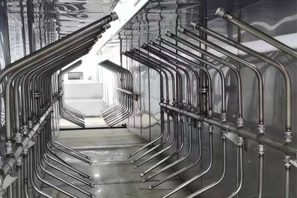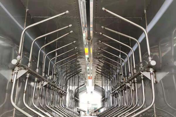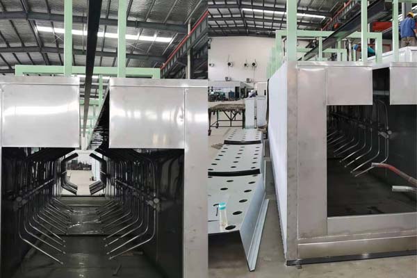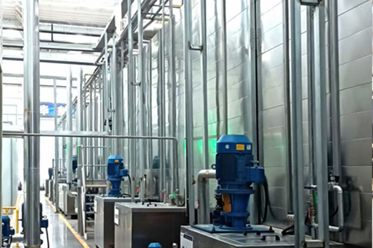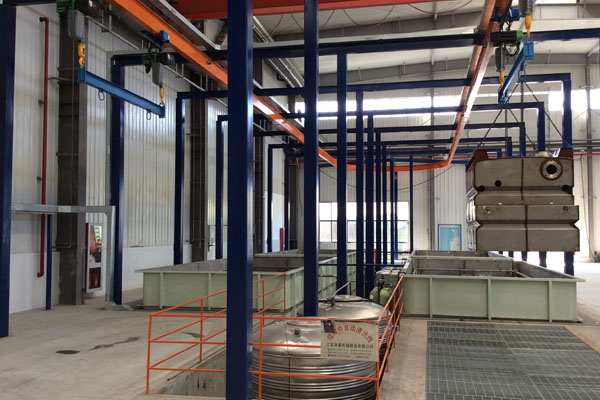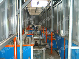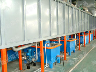 前處理生產線結構特點是:前處理生產線各工序噴淋管布置在隧道內,噴淋由各液槽的泵來提供.各工序間都有門洞板隔開,以防竄液.各加熱液槽的加熱形式有槽內和槽外。內加熱器有排管、蛇形管、波紋板等;外加熱器有列管、板式加熱器等。加熱介質有熱水 、蒸汽、導熱油等。在脫脂、磷化工序分別設有除油系統(tǒng)和除渣系統(tǒng)。為防止各加熱段隧道頂部及門洞處溢出蒸汽,在隧道頂部設有排風機。